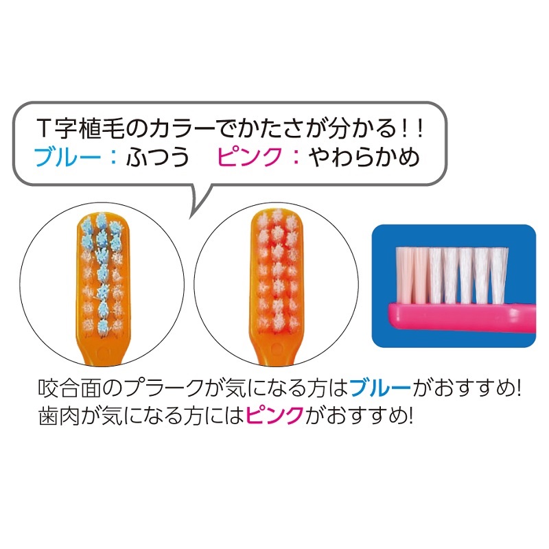 ナチュラル毛と少し硬いT字型カラー毛のMix植毛でプラークを効率的に除去。つま先磨き、かかと磨きに有効で毛が開きにくい設計。