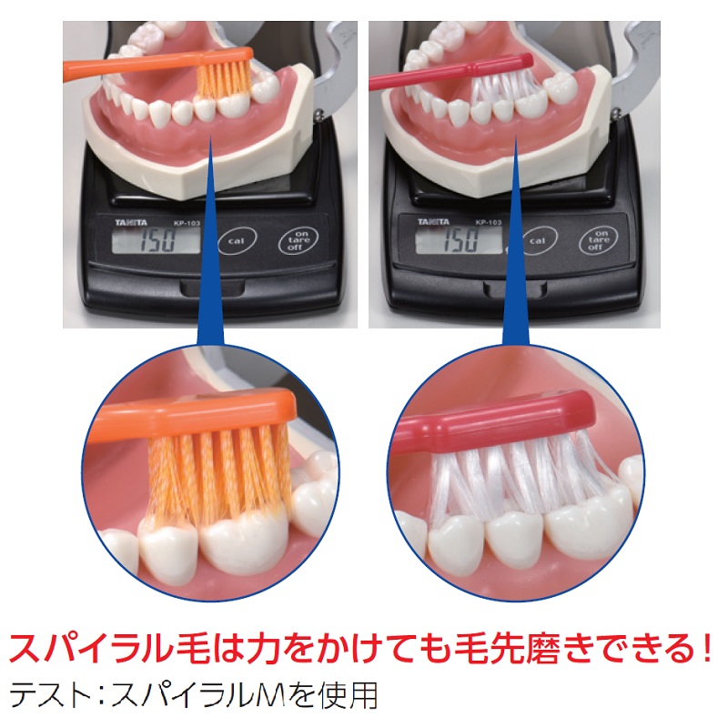 超先細毛が歯周ポケットに入り込み汚れをかきだし、フラット毛が歯面についた汚れを落とします。一般的なブラッシング圧(100~200g)をかけた際に、毛先磨きがしやすく、効率的にプラーク除去!