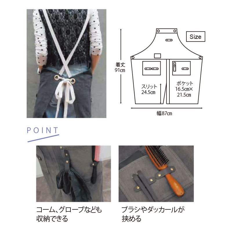 ヘアダイブラシやタイマー、ブラシ、ダッカールなどを引っかけたりできるベルト、グローブなど引っかけられるホルダー、汗で蒸れない革ではない生地ベルトなど美容師の利便性を考えたデザインです。