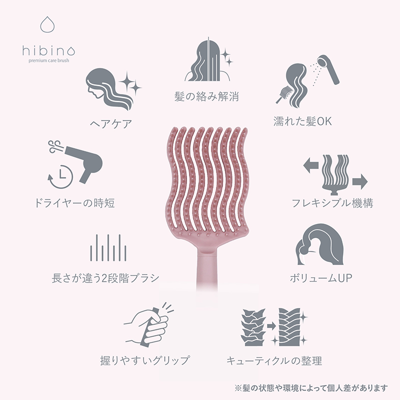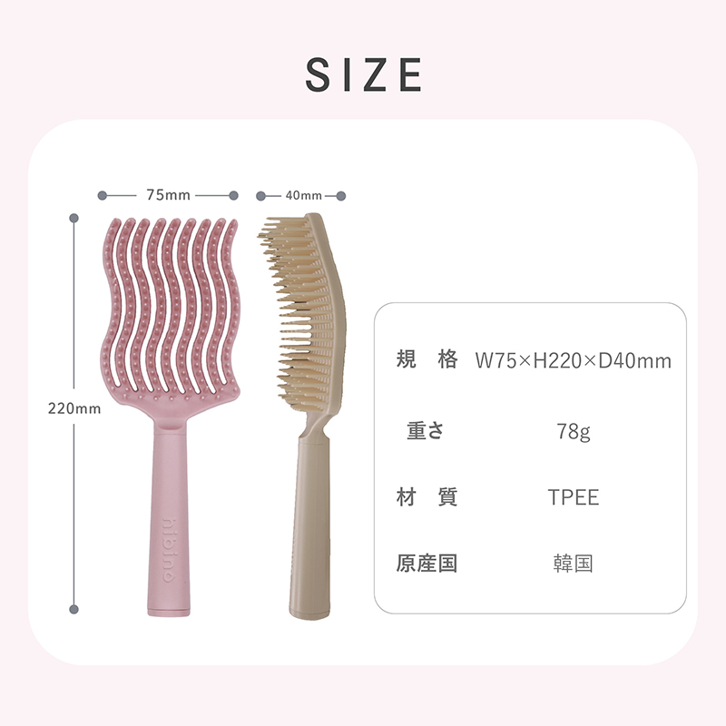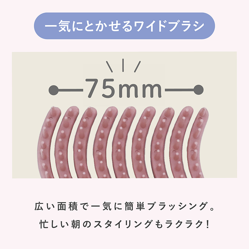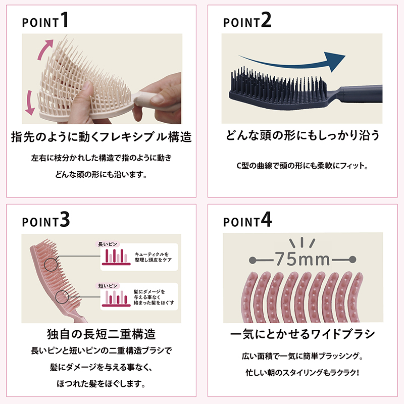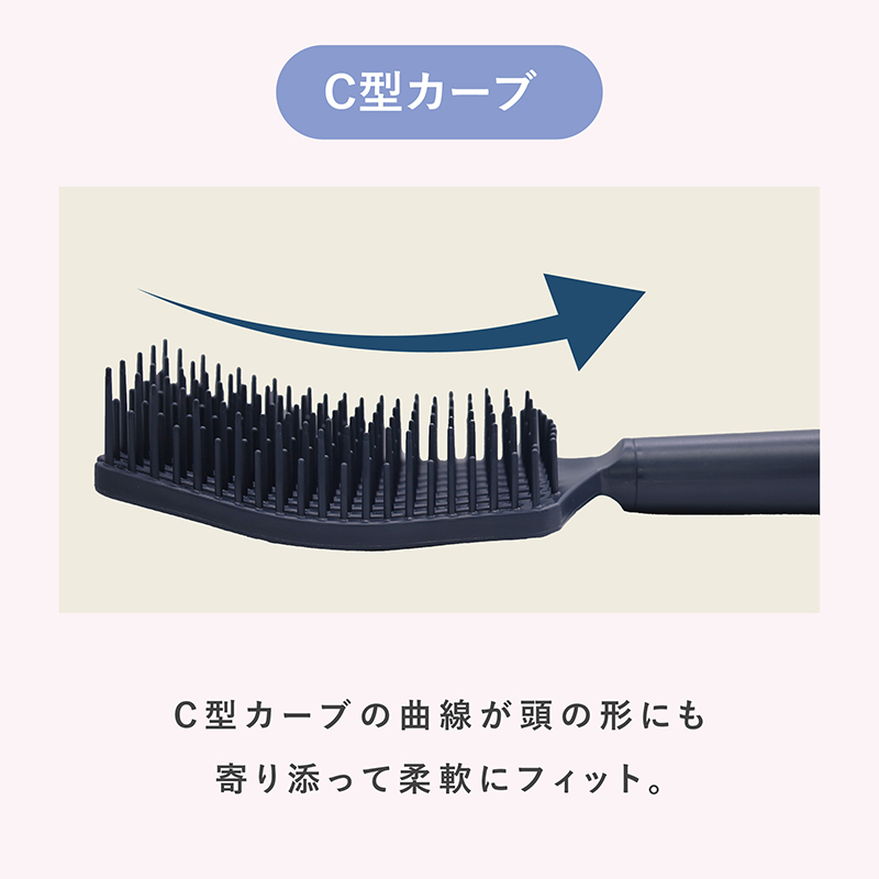 指先のように動くフレキシブルな構造、C型カーブの曲線でどんな頭の形にもフィット!独自の長短2重構造ピンでほつれた髪をほぐし、ワイドなブラシで一気にブラッシングができます。