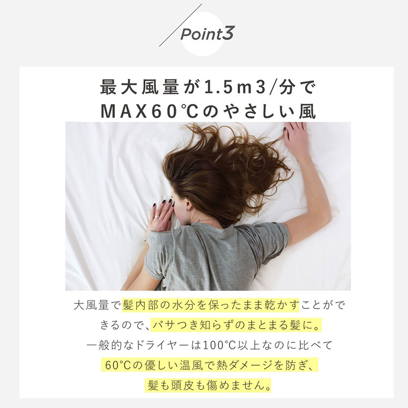MAX約60℃の低温風で、髪や頭皮への熱ダメージを軽減します。