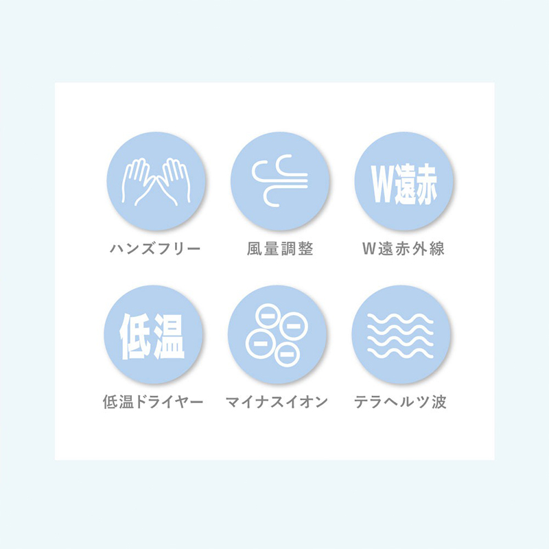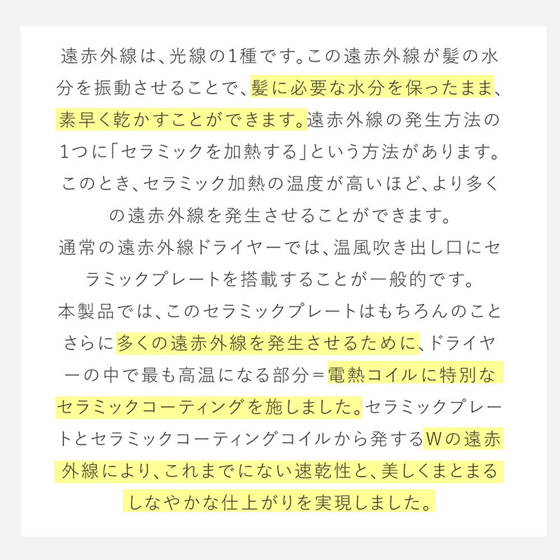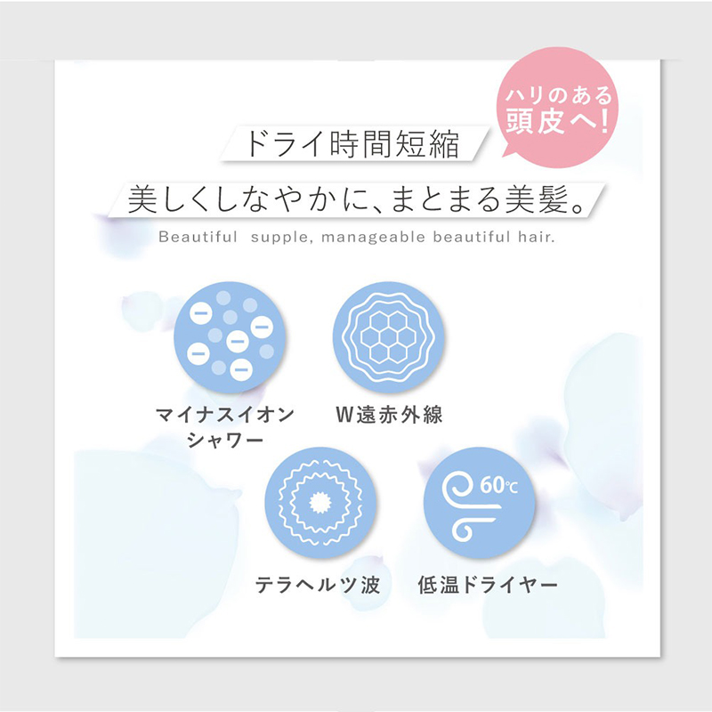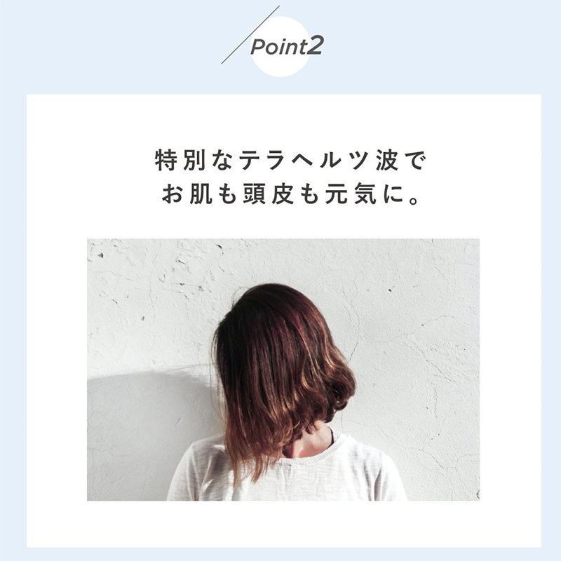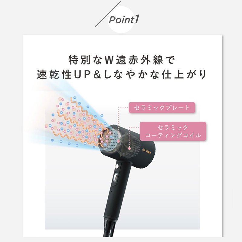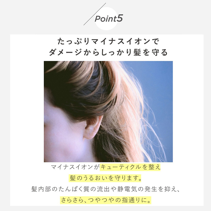 約200万個/m³のマイナスイオン搭載で、キューティクルを整え髪の潤いを守ります。遠赤外線をダブルで発生させることで、素早く乾かし美しくまとまる髪へ。