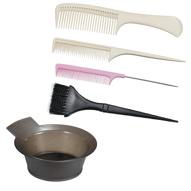 ヘアダイブラシ、ヘアダイカップ、マルチテールコーム、ジャンボコーム、ピンテールコームの5点セット。※それぞれ単品でもご購入いただけます。