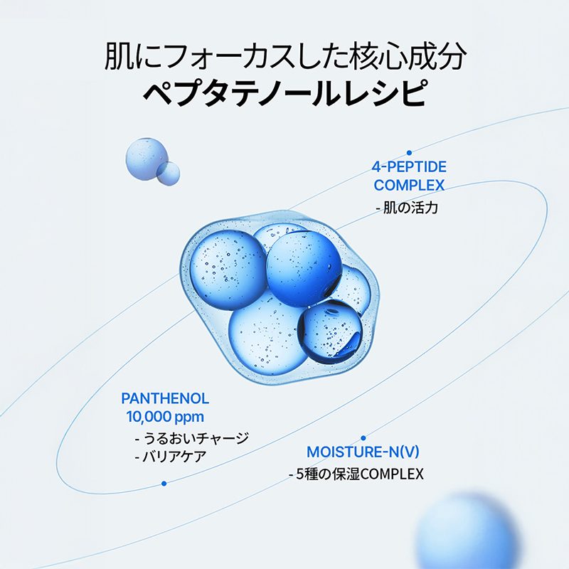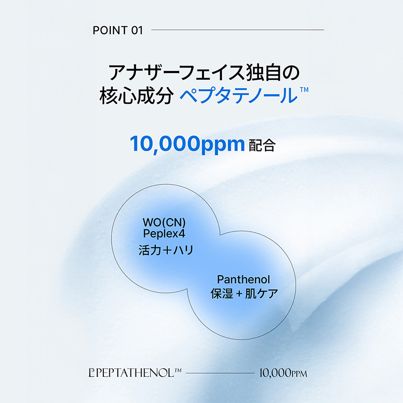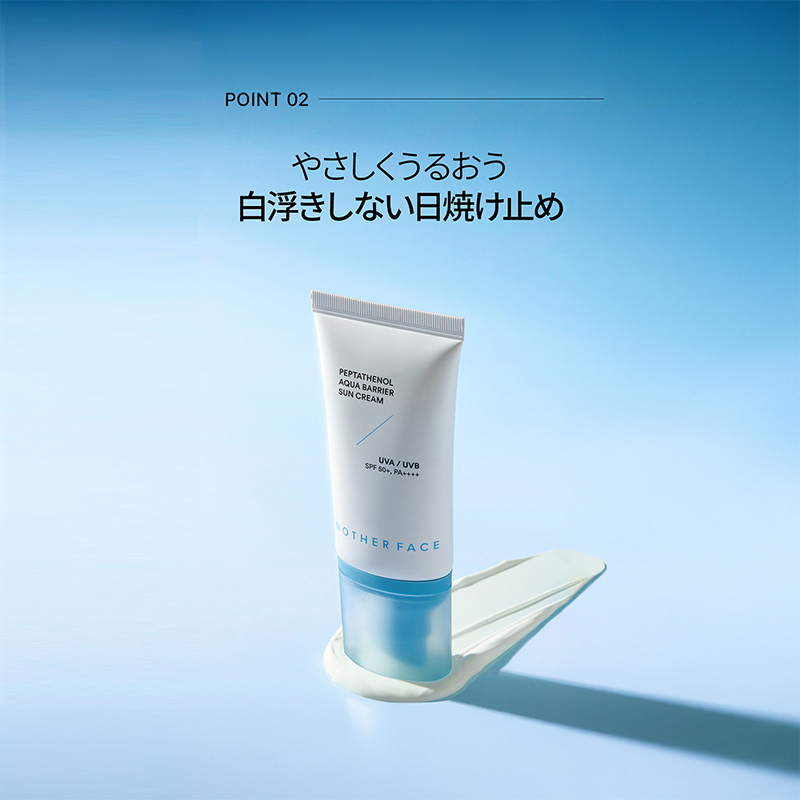 独自の核心成分「ペプタテノール」を10,000ppm配合。肌の活力や保湿にフォーカスした水光レシピが肌をやさしくケアし、紫外線を強力ブロックします。