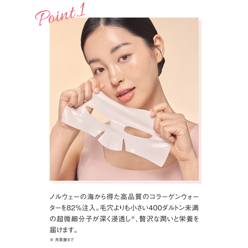ノルウェーの海から得た高品質のコラーゲンウォーターを82%注入。毛穴よりも小さい400ダルトン未満の超微細分子が深く浸透して※潤い、疲れた肌に活力を与えます。