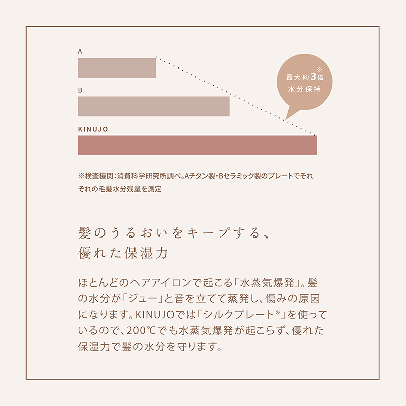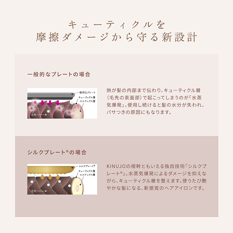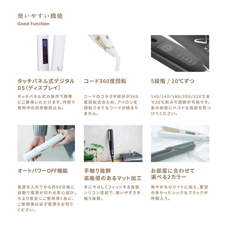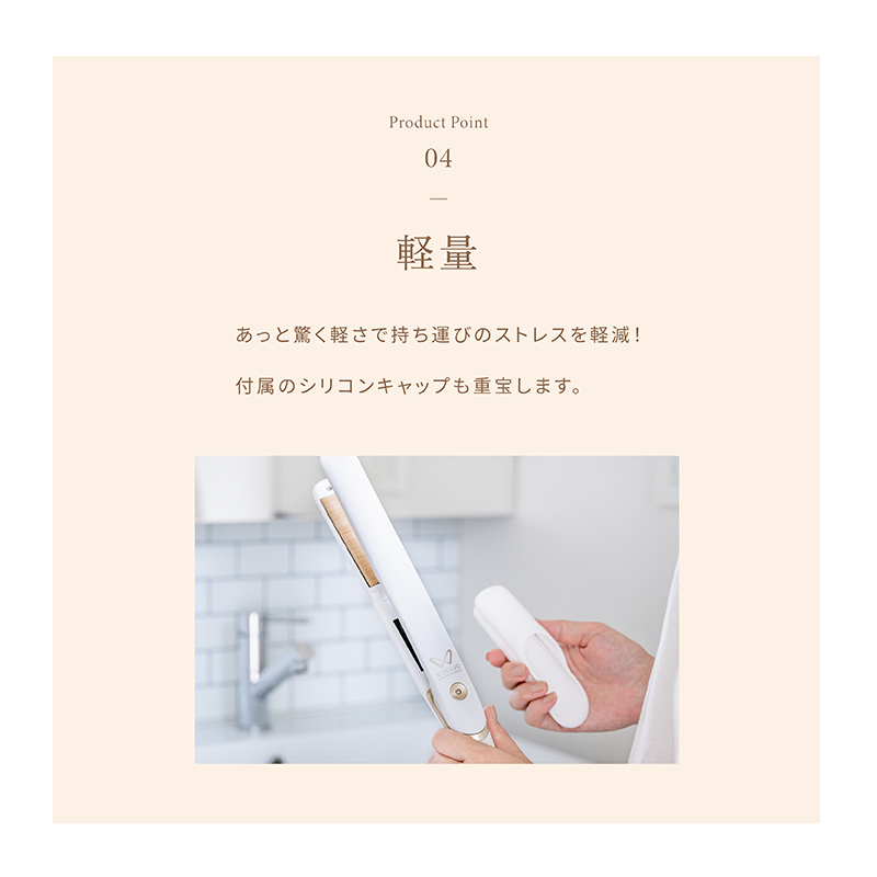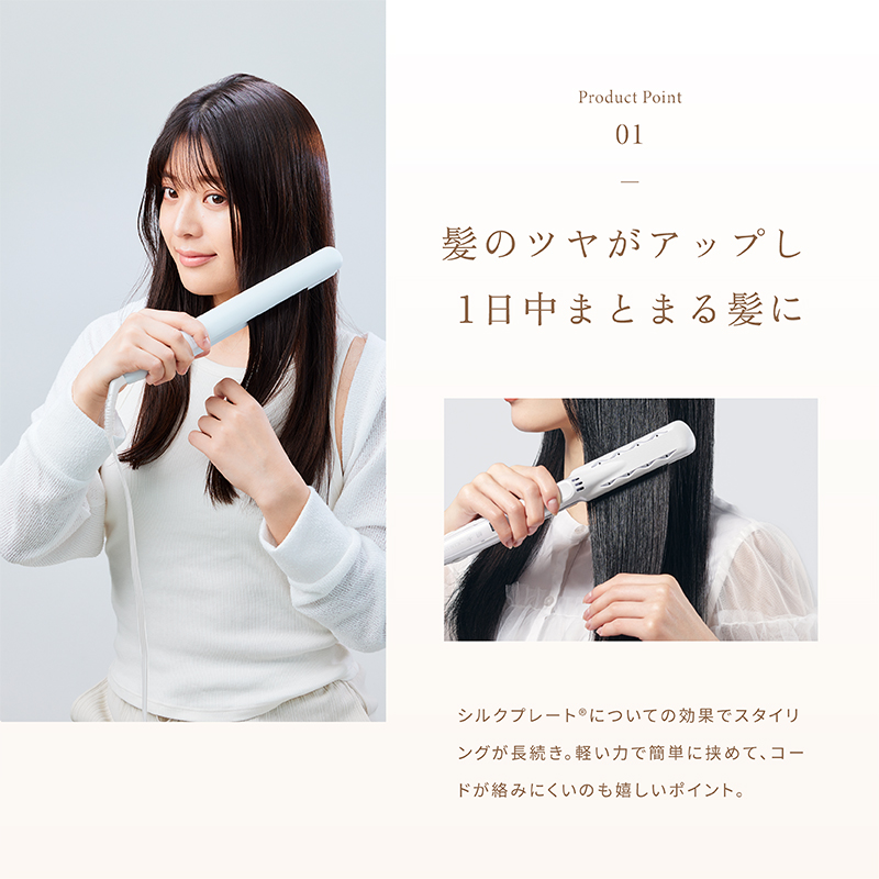海外でも使えるストレートアイロン。シルクプレート®の効果でスタイリングが長持ちし、軽い力で簡単に挟むことができます。