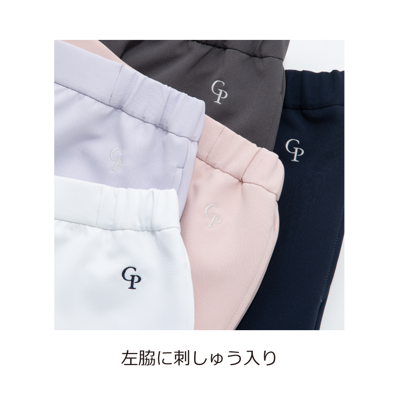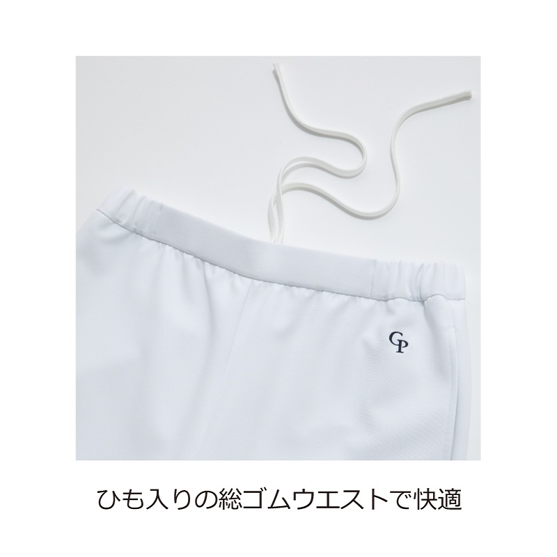 脇後ろゴムウエスト(ひも入り)、両脇ポケット、裾上げ済