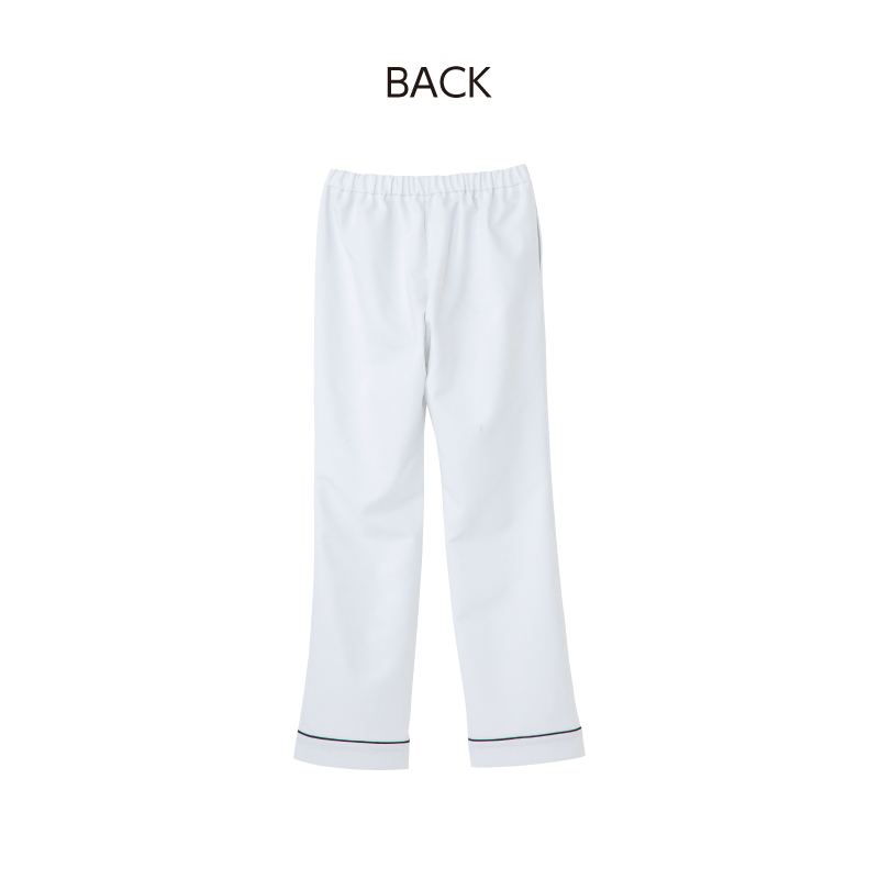 脇後ろゴムウエスト(ひも入り)、両脇ポケット、裾上げ済
