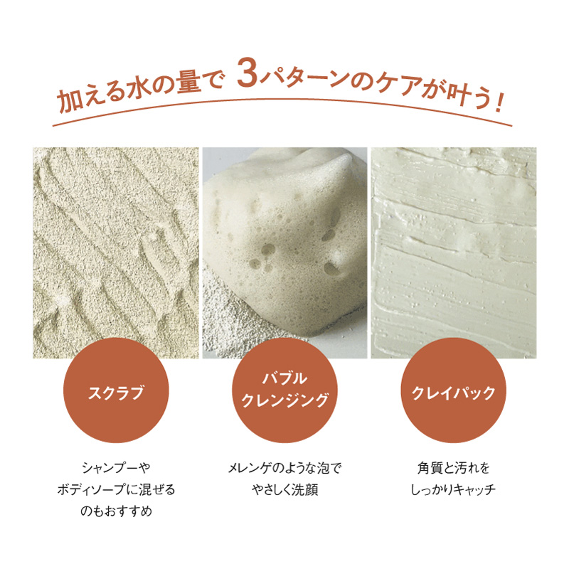 フランス産クレイを使用した酵素洗顔パウダー。100,000ppmという高濃度のクレイが毛穴をすっきりとクリアにし、ヒアルロン酸やツボクサエキスなど肌に必要な栄養も補給します。