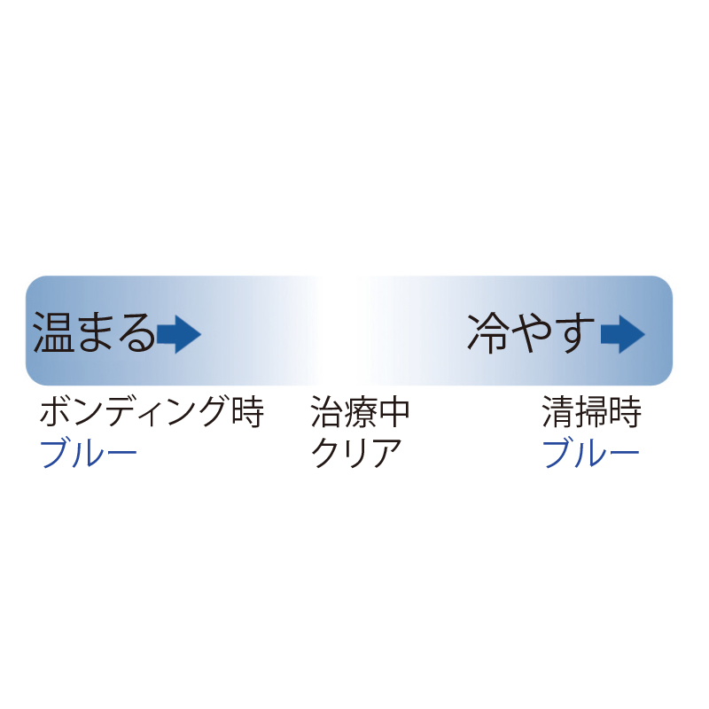体温で温まると色は消え、治療中はクリアとなる。 ディボンディング時は冷やすと再びブルーになるため、除去が容易に