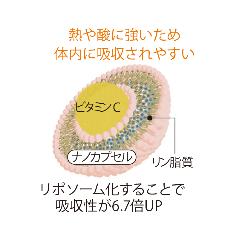 リポソーム(細胞膜に似たリン脂質の人工膜カプセル)でビタミンCを包み消化液や酵素から守り細胞の奥までしっかり届けます。