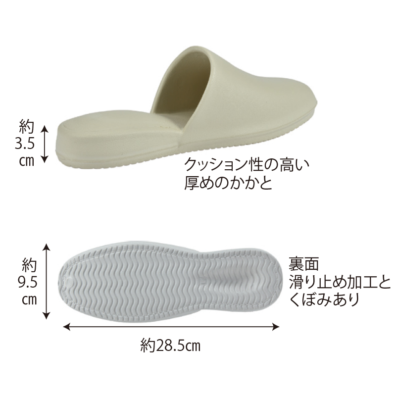 軽くて弾力のある、縫い目無しの一体成型スリッパ(大人用)クッション性の高い厚めのかかと(約3.5cm)が特長