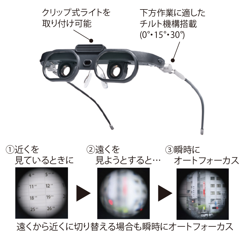 メガネなしで見たいところに自然とピントが合い頭や目の動きが減り疲労軽減!手元作業で遠近を繰り返し見る場合に適しています。