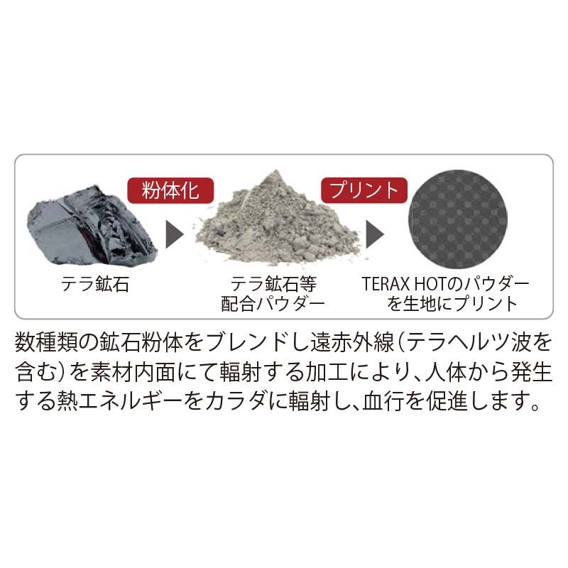 テラ鉱石を練りこんたプリント加工部分から、遠赤外線を放射することで暖かく感じる。数種類の鉱石粉体をブレンドし遠赤外線(テラヘルツ波を含む)を素材内面にて輻射する加工により、