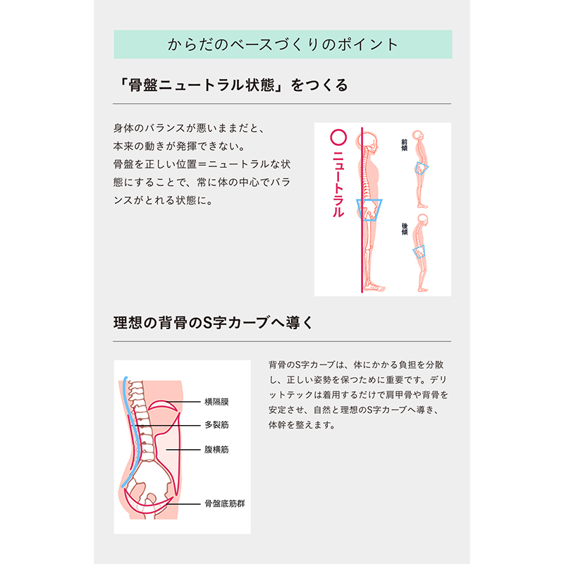 皮膚の感覚センサーを利用した「低筋圧理論R」を採用生地の裏面に施した独自の凹凸構造が肌に触れることで皮膚の感覚センサーを自然に刺激。身体本来のパフォーマンスを発揮できるよう筋活動を促し、理想的な身体作りのベースをととのえます。
