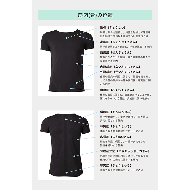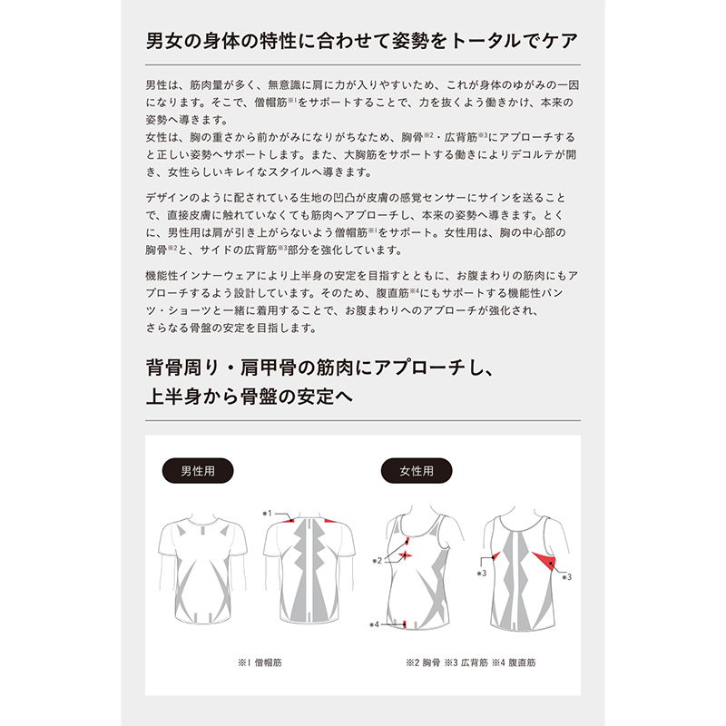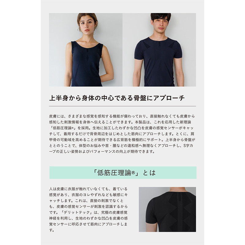 皮膚の感覚センサーを利用した「低筋圧理論R」を採用生地の裏面に施した独自の凹凸構造が肌に触れることで皮膚の感覚センサーを自然に刺激。身体本来のパフォーマンスを発揮できるよう筋活動を促し、理想的な身体作りのベースをととのえます。