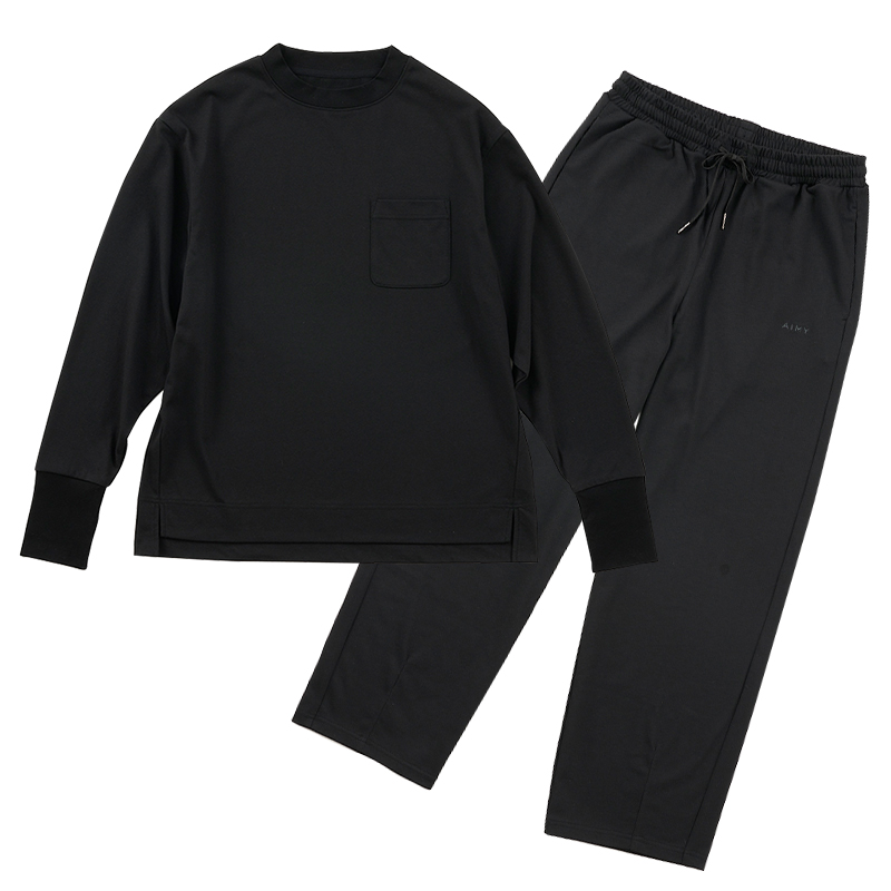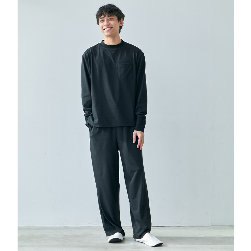 動きやすく快適なルーズシルエット。パンツはトレンドを取り入れたバレル。パジャマ・家着としてはもちろん、タウンユースも可能にしました。吸湿、速乾性が高く、お家で丸洗いできるので、汗ばむ季節も快適です。