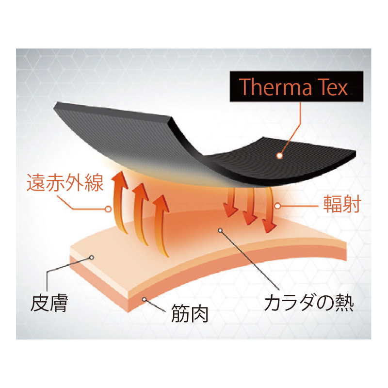 高い熱伝導性を活かして、 素早くリカバリー独自開発の特殊繊維 「Therma Tex」熱伝導率に優れた素材「グラフェン」に加え、複数の鉱石を独自にブレンド。AiMYの独自開発繊維「Therma Tex」が身体の熱を吸収し、血行を促進。日常の疲れはもちろん、運動・筋トレ後の疲労をリカバリーします。