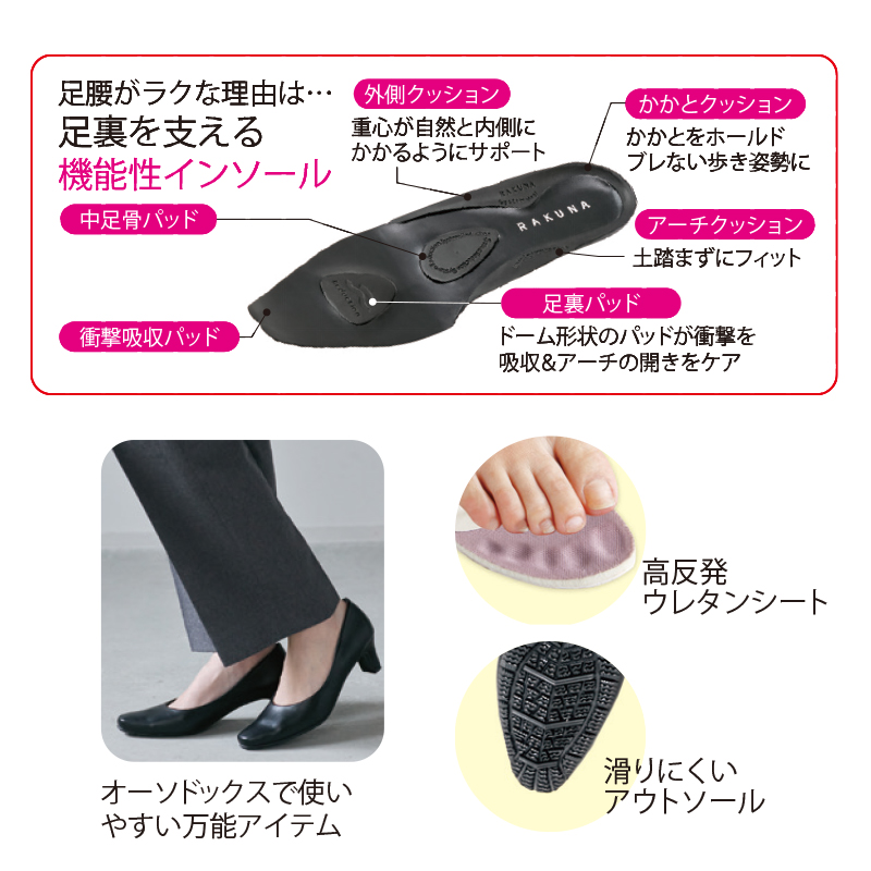 インソールに施された6つのクッションが足裏の筋肉にアプローチ。整体で疲れた足を優しく包むように足裏のアーチにフィット