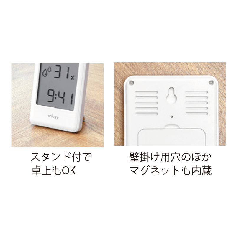 大きな画面に温度・湿度・時計の表示がわかりやすいスタンド・フック穴が付いていてさまざまな場所で使用できる