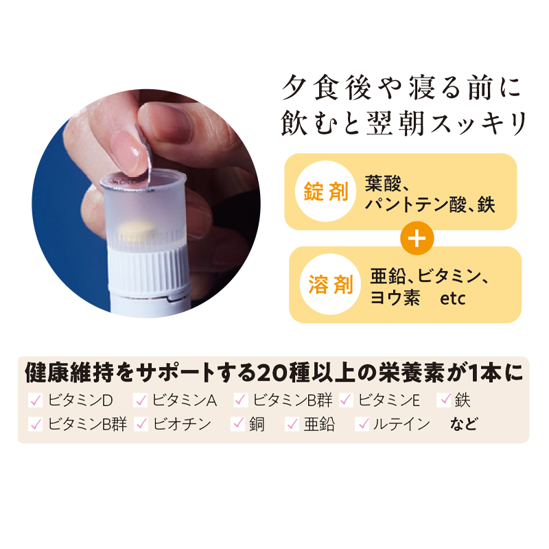 普段の生活で不足しがちな20種類以上の栄養素が含まれているドリンク×錠剤のサプリメント