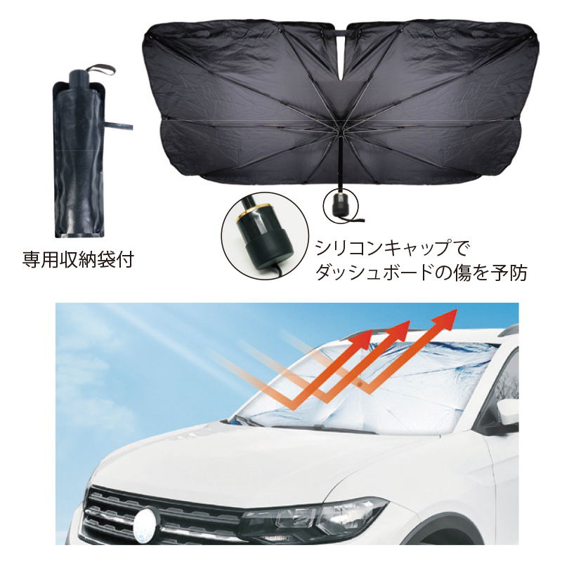 シリコンキャップ付きで車内を傷つけずに使える、傘型サンシェード。広げるだけでフロントガラスを素早くカバーし、熱と紫外線を99.5%以上カット