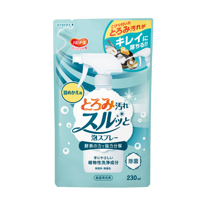 こびり付いたとろみ汚れに泡が密着。酵素の力で強力分解します。手に優しい植物性洗浄成分配合。
