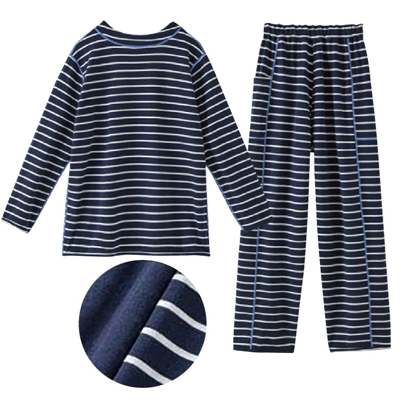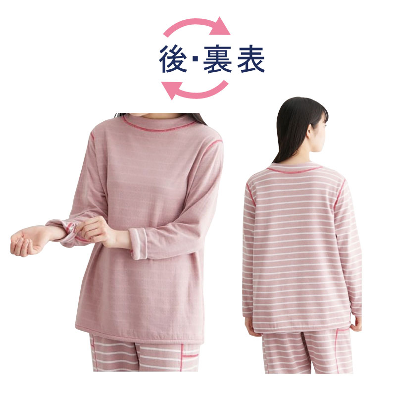 前後・裏表を気にせず着られるパジャマ。「どっちが前?」「裏返し?」の迷いがなく、着る人も介護する人も安心。表はボーダー、裏は無地のリバーシブルデザインです。