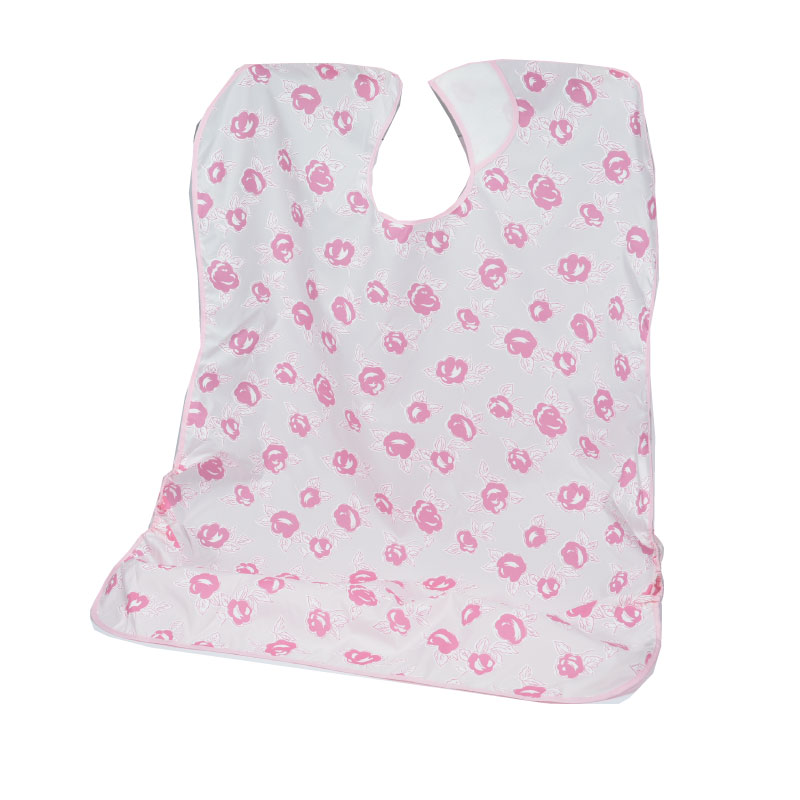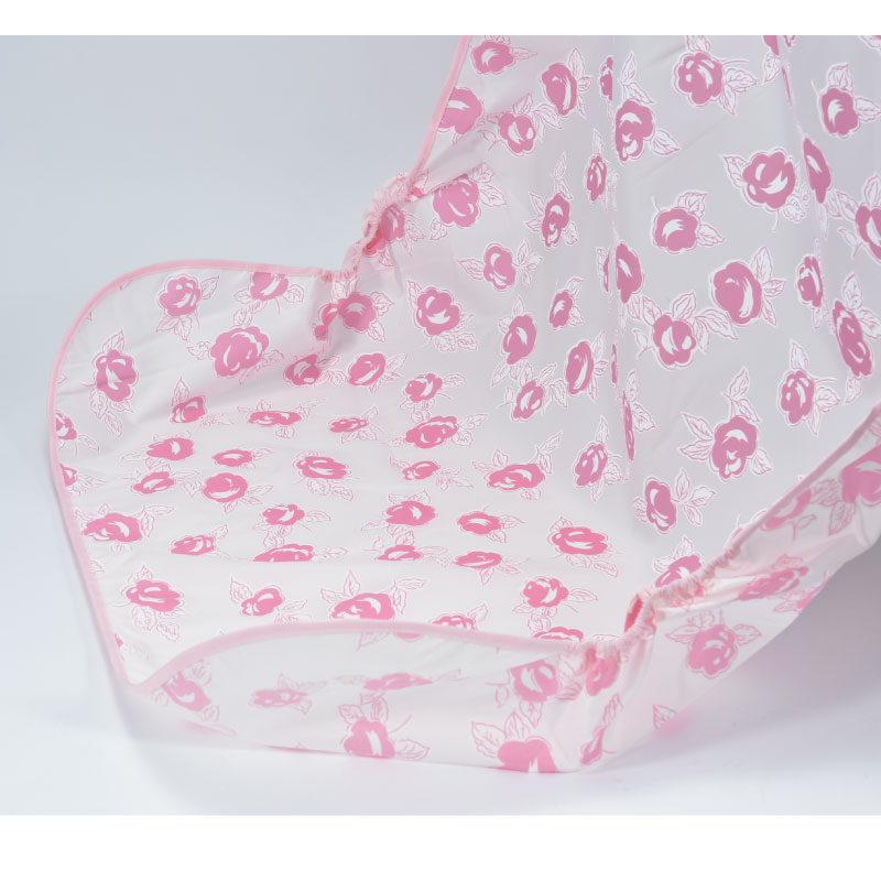 ギャザー付きでこぼれた食事をしっかりキャッチ!華やかなバラ柄で食卓を彩ります。