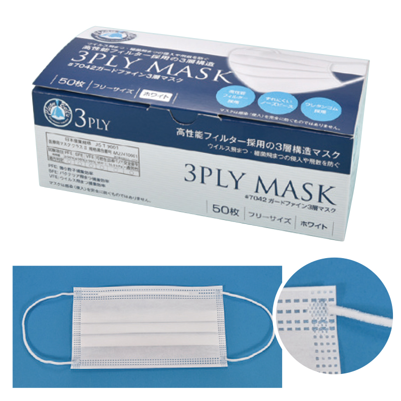 | 材質 | 不織布:ポリプロピレン ノーズピース:ポリエチレン 耳かけ紐:ポリエステル、ポリウレタン |