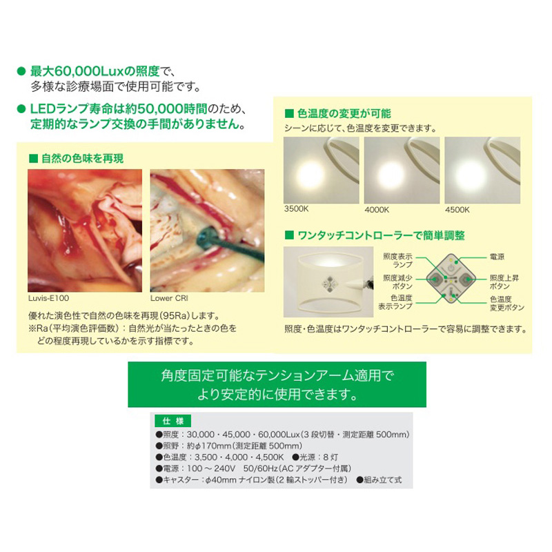 最大60,000Luxの照度で、多様な診療場面で使用可能です