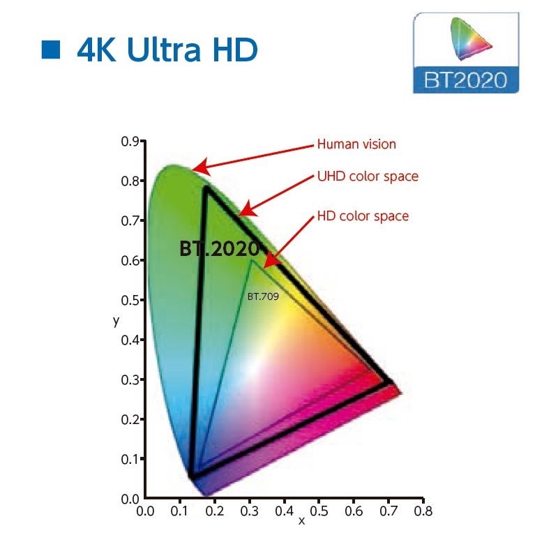 最新の4Kテクノロジーの解像度はフルハイビジョンの4倍の画素数を持ち、従来のHD色域(BT.709)より広い4K(BT.2020)の色域が