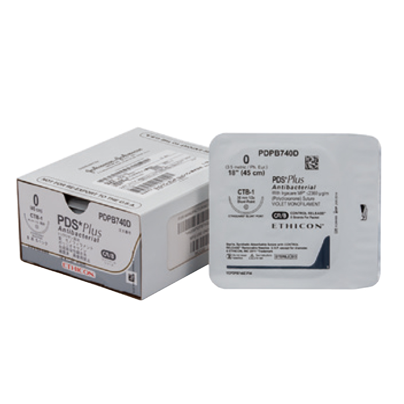 | 材質 | 糸:ポリジオキサノン、着色剤(紫色 201 号)、抗菌剤(トリクロサン(2365μg/m 以下)針:ステンレス鋼(ニッケル、クロムを含む)、コーティング剤(シリコーン油を含む) |