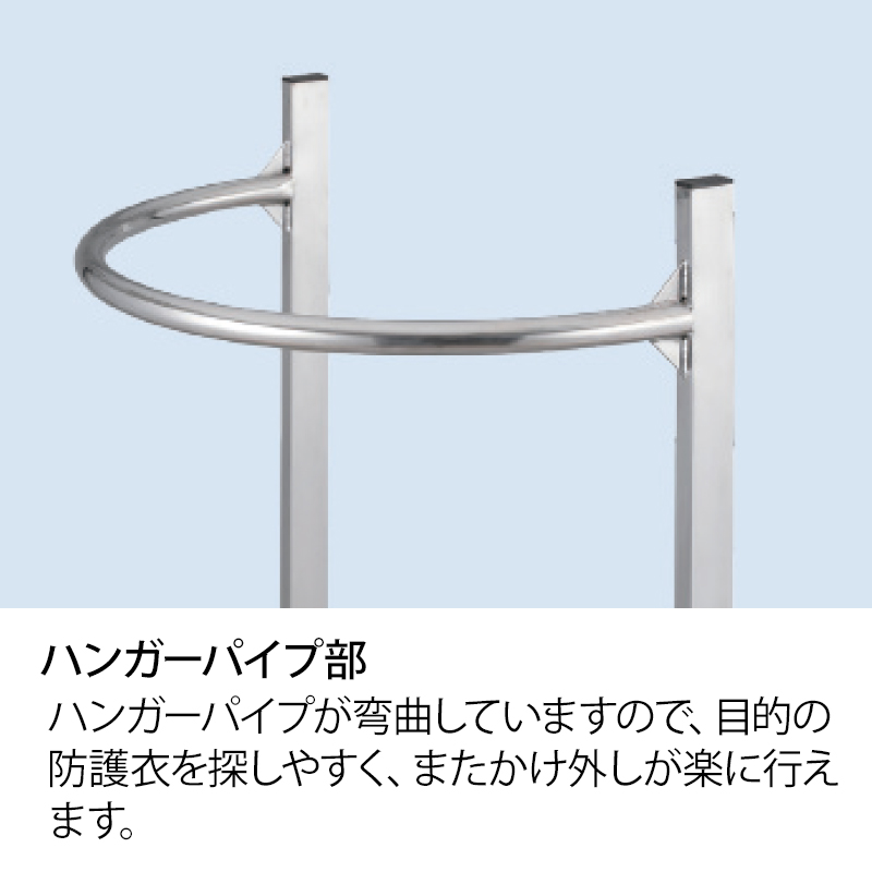 ハンガーパイプが湾曲しているため、多くの防護衣を掛けることが可能!
