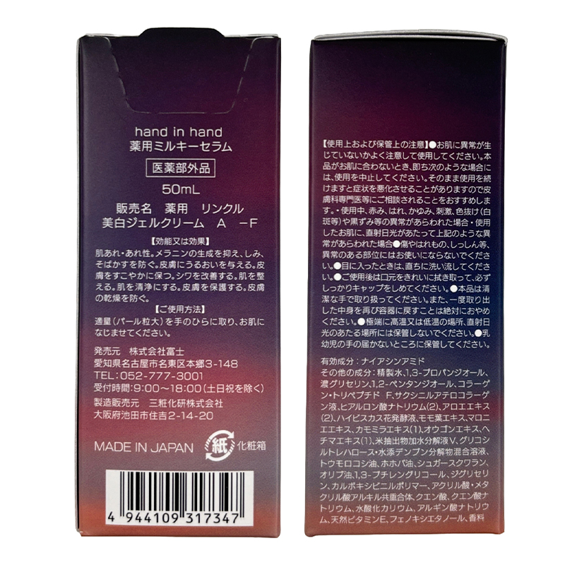 | 成分 | ナイアシンアミド、精製水、1,3-プロパンジオール、濃グリセリン、1,2-ペンタンジオール、コラーゲン・トリペプチド F、サクシニルアテロコラーゲン液、ヒアルロン酸ナトリウム(2)、アロエエキス(2)、ハイビスカス花発酵液、モモ葉エキス、マロニエエキス、カモミラエキス(1)、オウゴンエキス、ヘチマエキス(1)、米糠抽出物加水分解液V、グリコシルトレハロース、水添デンプン分解物混合溶液、トウモロコシ油、ホホバ油、シュガースクワラン、オリブ油、1,3-ブチレングリコール、ジグリセリン、カルボキシビニルポリマー、アクリル酸・メタクリル酸アルキル共重合体、クエン酸、クエン酸ナトリウム、水酸化カリウム、アルギン酸ナトリウム、天然ビタミンE、フェノキシエタノール、香料 |