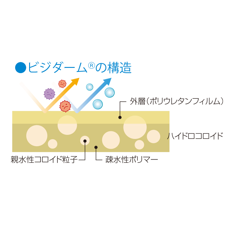 低刺激性のハイドロコロイドを採用。皮膚への刺激が低く、長時間の貼付も安心。ポリウレタンフィルムによる優れた防水性。