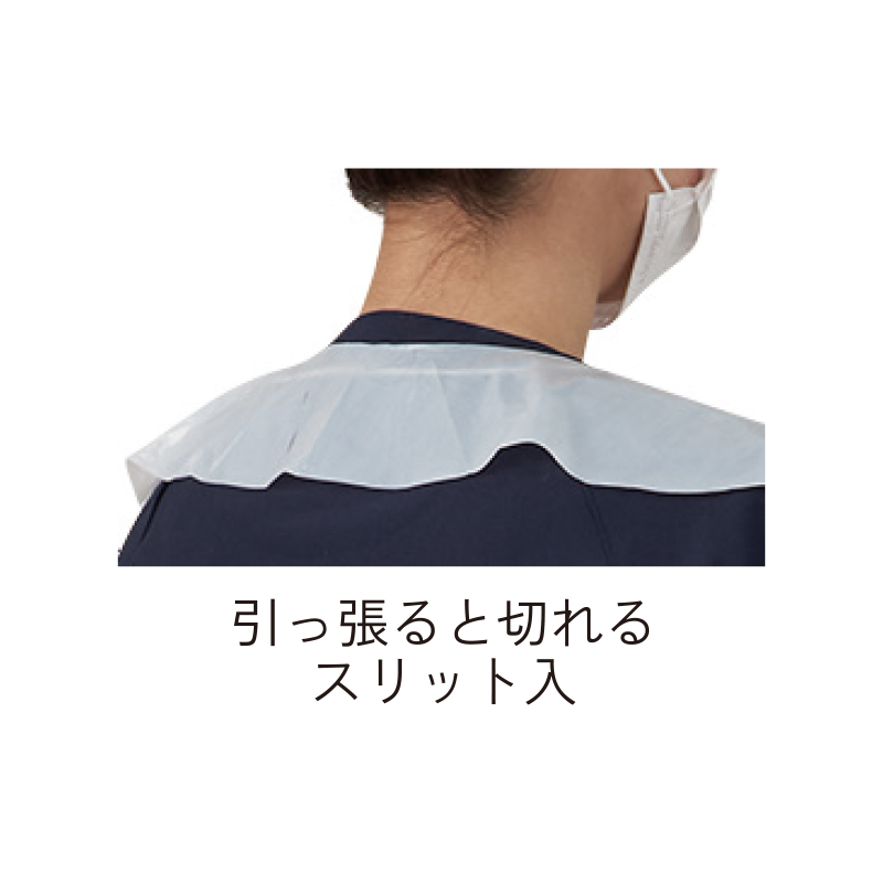 日常の衛生管理や軽作業に便利な袖なしタイプ。エンボス加工でまとわりつきにくく、広げやすい。