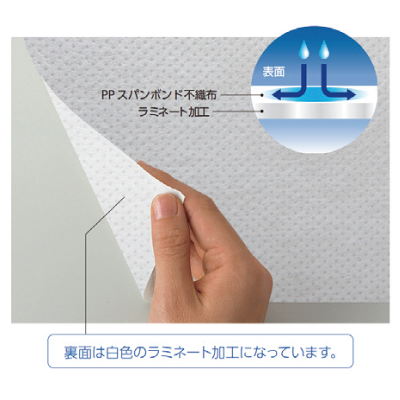 吸水性PPスパンボンド不織布にラミネート加工を施した素材で 液体を吸水し、裏側への浸透を防ぎます。