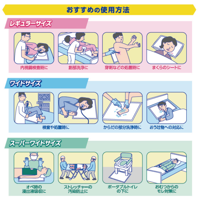 高吸収ポリマーが血液や滲出液などを素早く吸収●レギュラーサイズ:33×45cm
