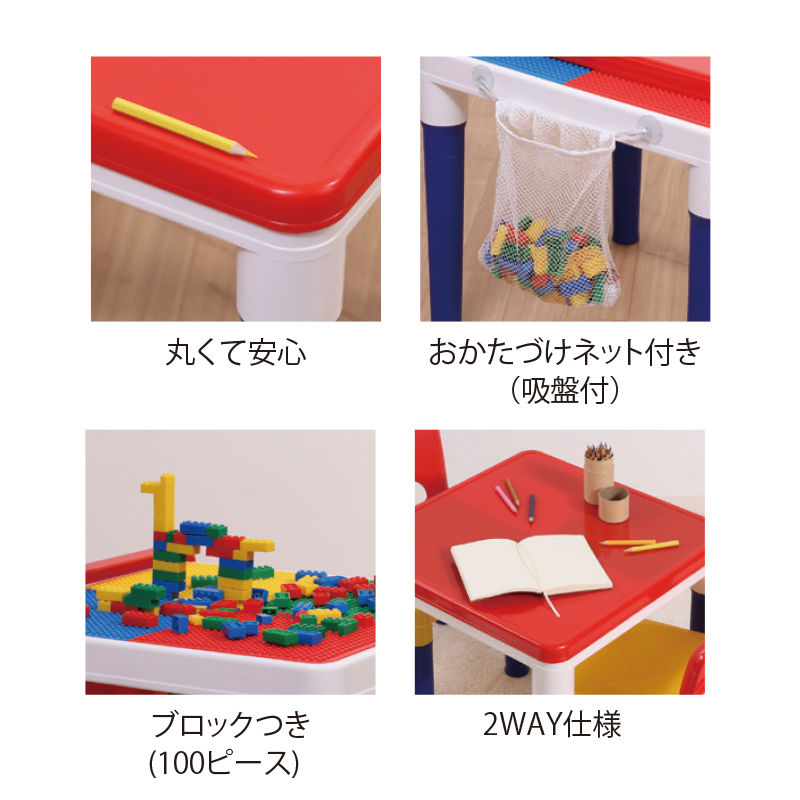 ブロック100ピース付きですぐに遊べます。テーブルの角が丸いので安全