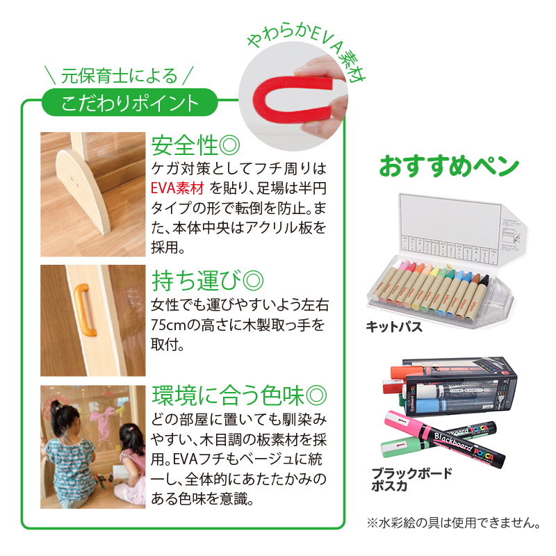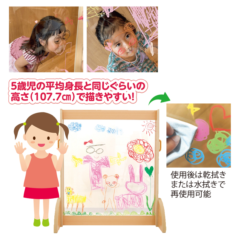 アクリル板にキットパスやブラックボードポスカで絵を描いて繰り返し遊べます♪組立てタイプなので、アクリル板にキズがついたら交換できます(別売)