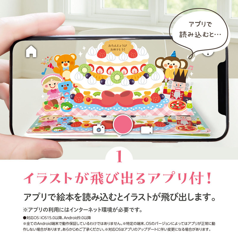 専用のアプリをダウンロードし、対象ページを読み込むとイラストが飛び出ます。記念に写真や動画を撮影することもできます。