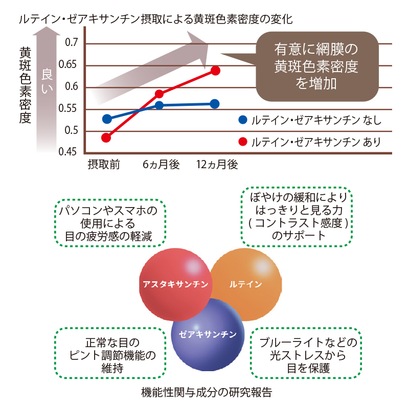 アスタキサンチン、ルテイン、ゼアキサンチンが含まれています。アスタキサンチンは目のピント調節機能を維持し、VDT作業による目の疲労感や肩・腰の負担を軽減すると報告されています。ルテインとゼアキサンチンは目を光ストレスから守り、はっきりと見る力やまぶしさからの回復をサポートします。