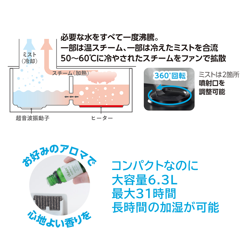 必要な水をすべて一度沸騰。一部は温スチーム、一部は冷えたミストを合流50~60℃に冷やされたスチームをファンで拡散商品詳細