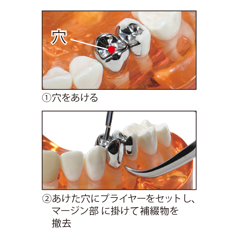 クラウン咬合面にダイヤバーで1.5mmの穿孔し、プライヤー先端突起部を穿孔に差込みクラウン撤去を行います。マージン部に掛けられない場合はバーで横スリットを入れてください。