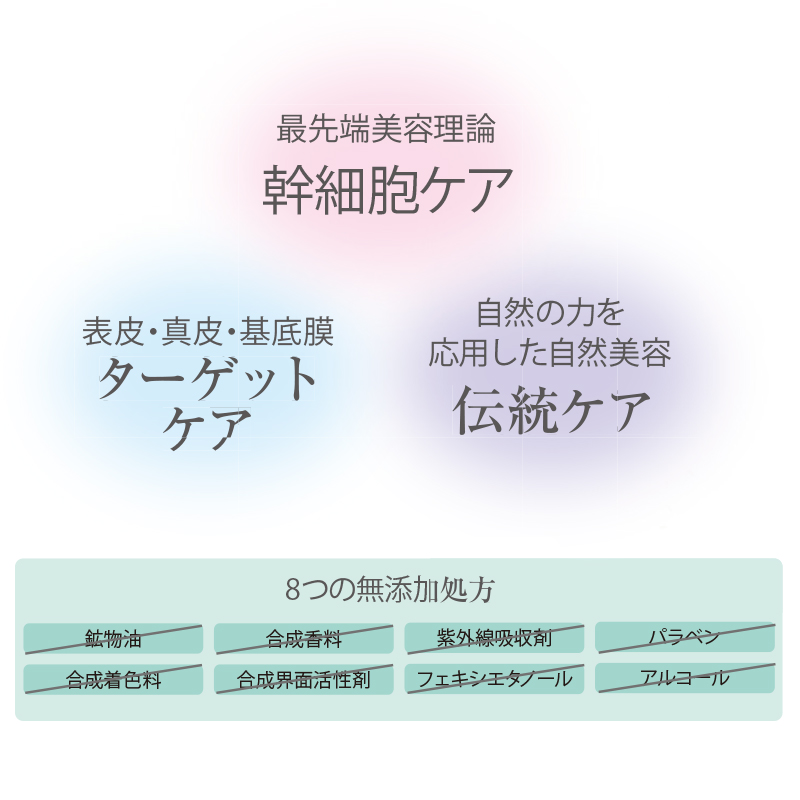 肌サイクルを支える3つの細胞に働き掛ける機能性ペプチド(4種)をはじめ、リンゴ果実由来の幹細胞エキス、国産鮭から抽出した保湿成分プロテオグリカン等を配合し、肌のエイジングサインをトータルケア。ベースに使用した「還元水素水」(特許取得)の浸透促進力と抗酸化力により、必要な部位に必要な成分を届ける。