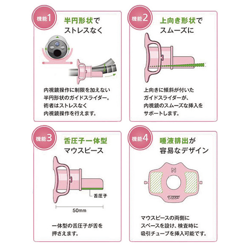 一体型の舌圧子でストレスを軽減。快適な内視鏡検査をサポートします。●材質:本体:ポリエチレン