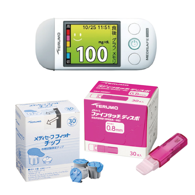 | 付属品・セット内容 | メディセーフフィットスマイル:1台、メディセーフフィットチップ:1箱(30個)、メディセーフファインタッチディスポ0.8mm(穿刺針):1箱(30本) |