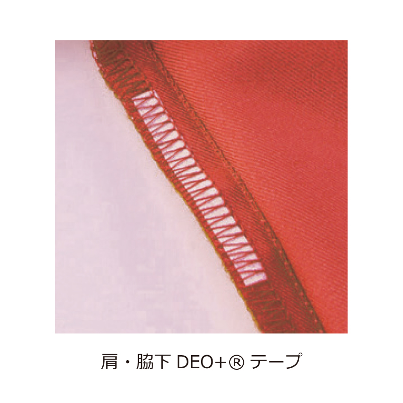 右肩スナップボタン、左胸二重ポケット、右脇ループ、両脇二重ポケット、肩・脇下DEO+Rテープ付