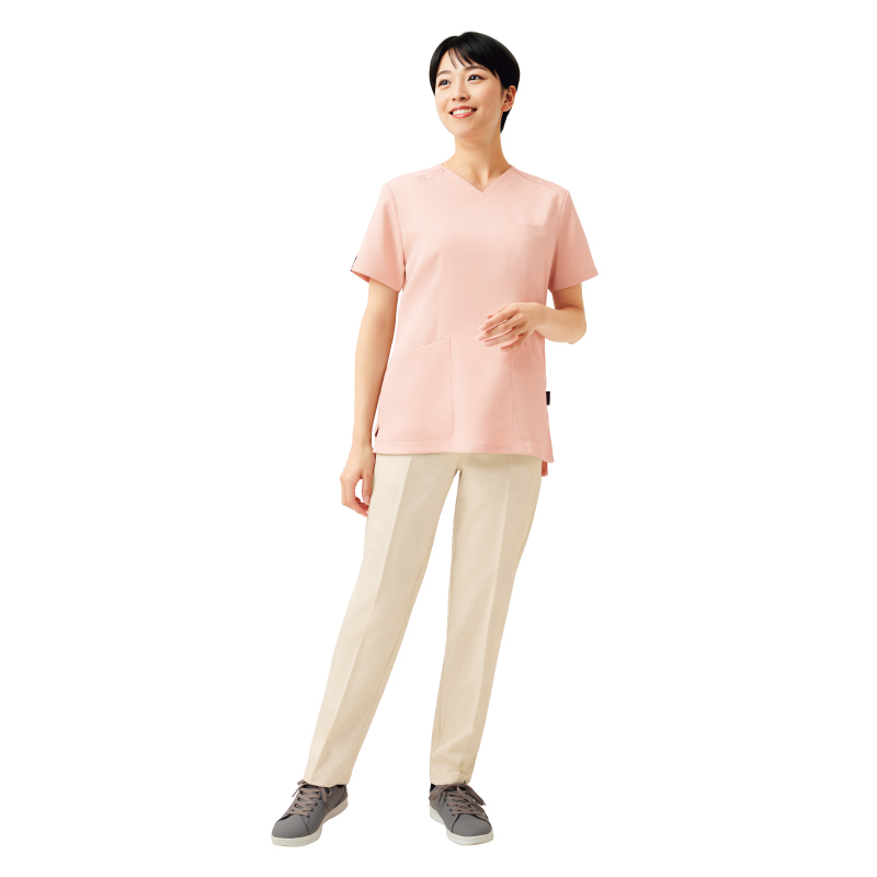 かぶりタイプながら女性らしいシルエットのスクラブ【制電】【ストレッチ】【吸水速乾】【イージーケア】